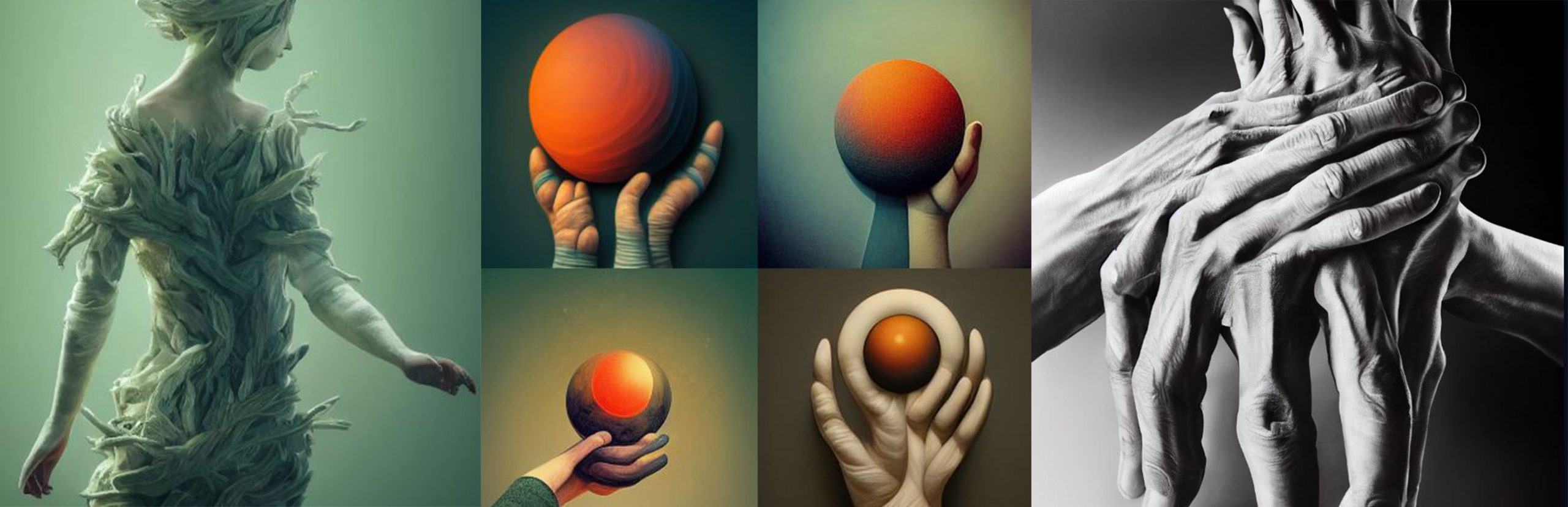 După cum se observă, reprezentarea mâinilor este o mare dilemă pentru Ai. Chiar și un prompt simplu precum: ”mâini care țin o sferă” nu poate fi redat. Am căutat prin comunitate și alte creații cu mâini. Verdictul: NU poate ”desena” mâini.